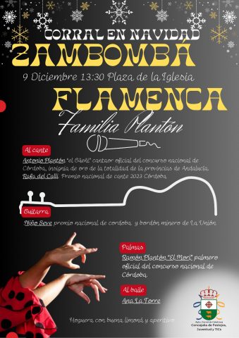 La zambombá es un espectáculo flamenco consistente en la interpretación de villancicos por tangos, rumbas, campanilleros y bulerías en una manifestación cultural heredada de padres a hijos, que en el caso de Corral de Calatrava protagonizarán el cantaor Antonio Plantón “el güeñi”, Rafa Del Calli premio nacional de cante en Córdoba, acompañados por la guitarra del Niño Seve premio nacional de Córdoba y bordón minero de La Unión . A las palmas les acompañarán Ramón Plantón “El Mori”, palmero oficial del concurso nacional de Córdoba; y al baile estará Ana La Torre.