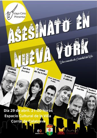 ‘Asesinato en Nueva York’, el divertido montaje escrito y dirigido por Cristóbal del Río, ganadora de tres premios en la Muestra Provincial de Teatro de la Diputación de Ciudad Real, que ha sido seleccionada en cuatro certámenes, tres de ellos de carácter nacional, será representada por la compañía “Vaya Cirio” de Manzanares, este sábado 29 de abril a las 21 horas, formando parte del catálogo de representaciones mensuales que se está ofreciendo este año con motivo del 50 aniversario del Grupo Popular de Teatro de Corral de Calatrava